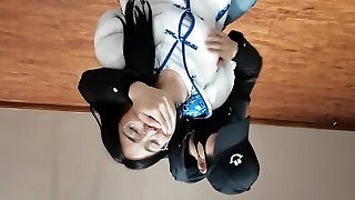 Asian babysitter in fishnets joys her pussy