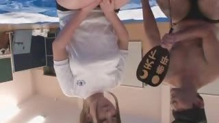 Thick titted MILF kicks Asian's bootie in wrestling, then fucks her!!